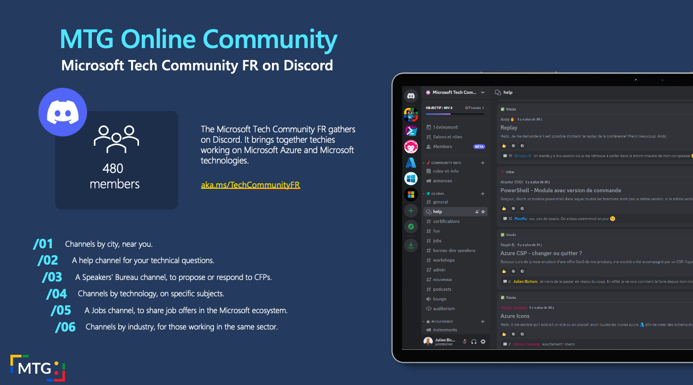 Communiquer avec les communautĂ©s MTG locales ; AccĂ©der directement aux responsables de chaque communautĂ© MTG ; AccĂ©der aux MVPs; Ătre informĂ© des prochains events ; AccĂ©der Ă des Microsoftees; Proposer un talk ou chercher des speakers via le âBureau des speakersâ ; Poster ou postuler via le canal Job; DĂ©couvrir le canal Podcast (si tu tâennuies quand tu conduis) ; DĂ©couvrir le canal Certifications (pour devenir un crack dans tous les domaines !) ; Proposer des missions en alternance pour les Ă©tudiants ; Participer ou proposer des workshops via la plateforme MOAW par exemple et encore plein dâautres choses, mais pour ca, faut venir đ